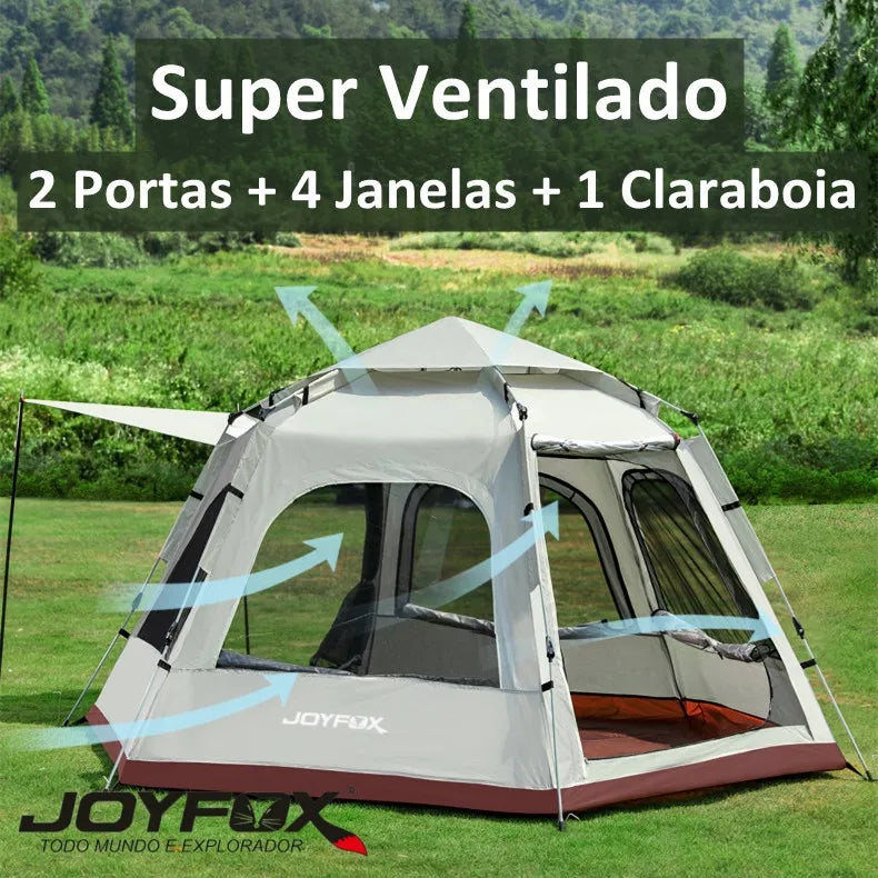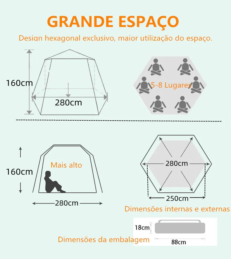 BARRACA INSTANTÂNEA DE FÁCIL MONTAGEM. Essa barraca externa não é apenas simples, mas também pode ser montada em apenas 10 segundos. Economize muito tempo de montagem e aproveite para acampar com a família e os amigos. Barraca para 5 a 8 pessoas com vestíbulo. A barraca de 4 estações oferece espaço suficiente para 5 a 8 pessoas, com tamanho de 280 cm de diâmetro x 160 cm de altura. O design exclusivo do vestíbulo da barraca oferece espaço extra e privacidade, além de servir como guarda-sol e abrigo contra chuva para essa barraca. Ventilação confortável. Com uma porta de duas vias, 4 janelas de malha e uma malha de ventilação superior, essa barraca de camping garante a respirabilidade.
